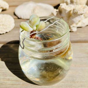 ブルーヘイズの葉挿し水栽培。 親葉がシオシオになって取れてしまい、バランスが変わってしまったので、瓶を変更。
