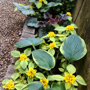今日は🤗。 快晴で気持ちいい一日です。 西側の花壇に植えてるお花達。 ホスタ(ギボウシ)、フューケラ、リシマキア 大好きなお花ばかりです。