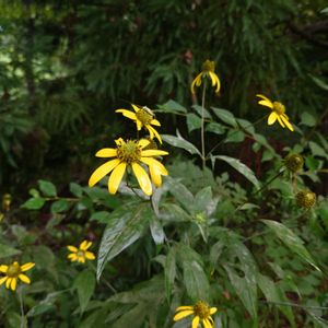 オオハンゴンソウ(大反魂草) キク科 オオハンゴンソウ属 7~10月 0.5~3m 帰化種 多年草 根株から茎を叢生し、上部で分岐して高さ3mになる 茎下部の葉は長い柄があり5~7深裂し、裂片には粗い鋭鋸歯がある✨ 上部の葉は短~無柄で互生し、3~5裂または裂けない 葉の裏にのみ短毛がある 花径約6cm 頭花は黄色の舌状花が10~14個と黄緑色の筒状花からなり、舌状花はやや垂れ下がる 花床は半球形(→筒状花の部分が盛り上がっている) 果実は痩果 長さ5~6mm、扁平で4稜がある 冠毛は王冠形又は4鱗片で長さ1.5㎜以下 (coroniform(コロニフォーム)∶王冠のような形) ※ 生態系被害防止外来種リスト掲載種 総合対策外来種のうち「緊急対策外来種」に分類されている 「緊急対策外来種」∶対策の緊急性が高く、積極的に防除を行う必要がある ※ 外来生物法(環境省)により「特定外来生物」に指定されている 「特定外来生物」∶飼育・栽培、運搬、輸入、野外への放出、譲渡などが規制される (生きたままの移動や保管、植栽や播種、無許可の者への譲渡などなど) 罰則あり⚠ 最高で懲役3年、罰金300万円(個人)または1億円(法人)が科される場合がある