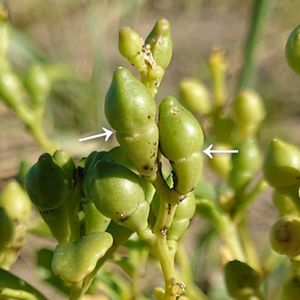 オニハマダイコン(鬼浜大根) アブラナ科 オニハマダイコン属 6~8月 15~50cm 1年~越年草 オニハマダイコンの果実は2節からなり、上部分は先の尖った卵形で大きい 上下それぞれに種子がふつう1個入る 熟すと画像矢印の節の部分で分離して上部分が落下し、海流散布を担う(果実はコルク質) ※バラスト水による移入も指摘されている 果実の下半分はそのまま残存し翌春その場で発芽する 生態系被害防止外来種リスト掲載種であり、総合対策外来種(その他の総合対策外来種)に分類されている 近くにはハマニガナやハマヒルガオもあった