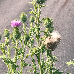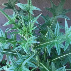 アメリカオニアザミ (亜米利加鬼薊) キク科 アザミ属 6~9月 80~150(200)cm 帰化種 欧州原産 「生態系被害防止外来種リスト」のうち、「その他の総合対策外来種」に区分されています 歩道や駐車場のアスファルトの隙間から生えていたりします💦😱 棘は非常に危険⚠👿 総苞や葉だけでなく、茎にも鰭状の鋭い棘をもちます 駆除対象です 駆除する時は、できるだけ花が咲く前に、花が咲いたものは種子を飛ばさない様に注意をして、厚手の革手袋着用で怪我をしないように💨