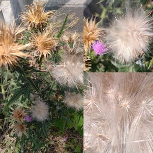 アメリカ鬼アザミ①〜④ 道沿いよそ様庭 😎生態系被害防止外来種。綿毛ボール4㌢大がふわふわ漂ってます😱 20年程前から近くでもよく見られるようになりました。🌸は魅力あるんだけど‥💦 我が庭でも何度か育ってほんと駆除大変でしたー😅😅