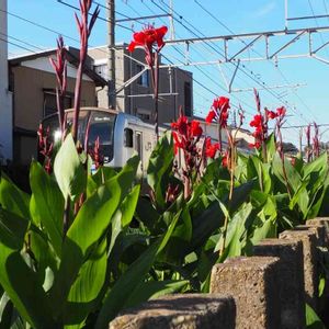 買い物帰りの 線路際•*¨*•.¸❀.*・゚✿゜:。* お花が 咲く季節に なりました😊💖 お花 3種、揃いましたぁ╮(。→‿Ő。)💕 あ 車窓からの 眺めも、春に なっていくのでしょうね╮(。→‿Ő。)💕