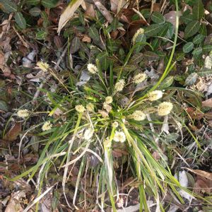 (サザンカの花弁ではなく)細い葉っぱです、花?穂?が出ています。自分で調べたところカンスゲじゃないかな、と思いますが合っていますか?