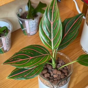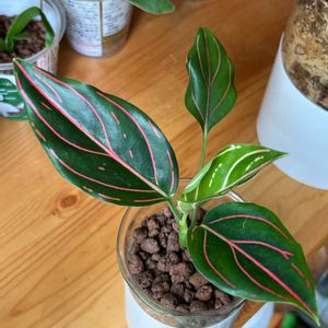 アグラオネマ三姉妹。 左から、ホワイトバレンタイン、ロッソ、ロタンダム。 葉の色も葉脈も絵に描いたよう。 しっかりくる鉢が見つからず、結局、ガラスにハイドロボールで植えました。 今のところ、順調に成長中。 アグラオネマは本当に丈夫で育てやすい✨✨