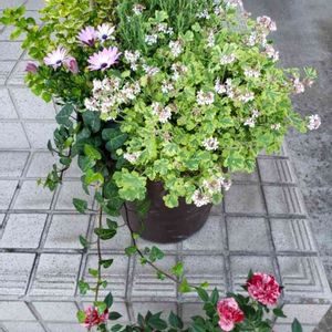 玄関先の寄せ植えの蔦が伸びて、ミニバラ🌹のところまで遊びに行っています。😆🎶 頑張れ❗日本‼️ ✊‼️