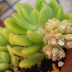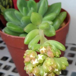 2021.4.18 1ヶ月前の写真です。冬の間徒長気味になってしまった多肉ちゃんも多く、こちらの春萌ちゃんも一部がビヨーンと伸びて小さなプツプツが発生。。病気かな…?とちょっと心配していたのですが、花芽だったのですね。 最近ようやく白いお花が開き始めました。今後、途中経過の写真も投稿していこうと思います(*^^*)