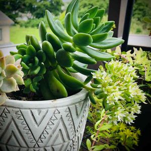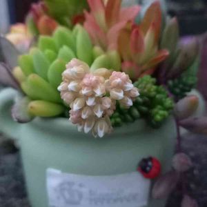 今日の花は、白系 🍂春萌 セダム属 🍂ロッティ エケベリア属 🍂グリーンペット セダム属 上2種は、花芽が出て手毬型の多花タイプです。 花弁は5枚で同じですが、雄しべの色が違う! 黒い雄しべは目立つね 下のグリーンペットは、 茎の先端に花の塊が付くタイプ 一体なので、カット✂️しにくい💦