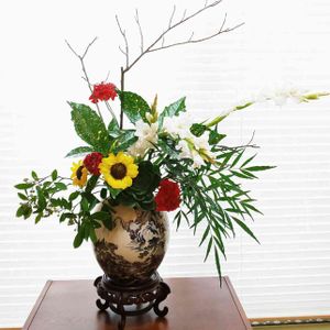🎉🎉🎉祝い花(和風)🎉🎉 今日も暑い1日でしたね オリンピックはメダルが沢山とれましたね🤗 頑張られた 選手のみなさんに おめでとうございます✨ の気持ちをこめて 先日のひまわりの 応援の花に 赤色のゼラニウムを足して 和風の祝い花にしました ひまわり グラジオラス ゼラニウム 七福神 西洋南天 実のえだもの あおき