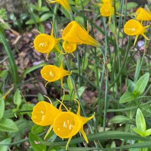 緑道を散歩中🚶♀️🎶 かわいい黄色のお花達に出逢いました✨🎶🌼( ◠‿◠ )V 小さなスカートのような形がかわいい💕🌼 葉っぱもとても細ーくて😆 あの、憧れのペチコート水仙に似ているのですがー🎶💕🌼🙋♀️名札を見ましたら、 バルボコディウムとありました。 小型原種水仙の代表的な種類だそうです💛 ナルキッスス、バルゴディウム 球根 山野草 花色 黄、白 原産国 フランス、スペイン、ポルトガルなどのヨーロッパ、モロッコなどの北アフリカ!