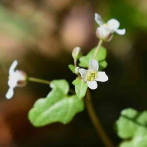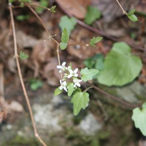 高尾山で出会えた花 ③ ユリワサビ(百合山葵) アブラナ科ワサビ属の多年草 別名:イヌワサビ 花期:3月〜5月 茎の先端に短い、まばらな花序をつける。花は白色の十字状の4弁花で、花弁の長さは4-6mm。 下調べはしていたので名前は知っていましたが、とても小さいお花で危うく見逃す所でした。 誰かがユリワサビの話しをしていて、(*゚0゚)ハッ❣️コレがユリワサビ❣️ 出会えて良かった😊