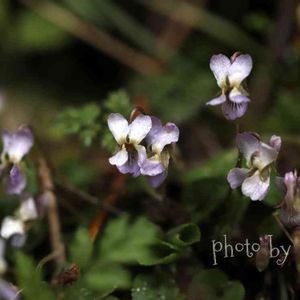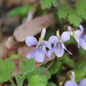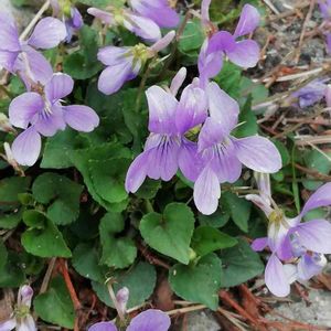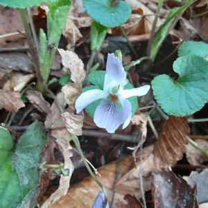七国峠古道 アオイスミレ(葵菫)、スミレ科スミレ属の多年草。 別名 ヒナブキ 🌼花言葉 「温順」「謙虚」 🌸葉は円形のハート型で全体に毛が多い。花は淡紫色から白色でウサギの耳を立てたような形に見える。葉がフタバアオイに似ていることから名付けられた。