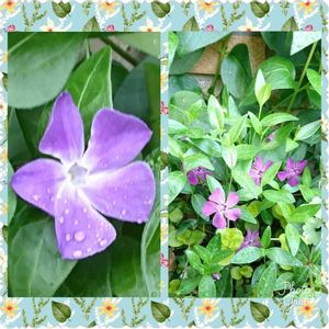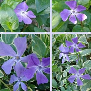 4/16(火)③ ツルニチニチソウ 上は駅近くの花が小さくて緑色の葉のヒメツルニチニチソウ。 右下は斑入りで花も葉も小さいヒメツルニチニチソウ。 左下は斑入りで花も葉も大きいツルニチニチソウ。 下2つはマンションの庭に咲いています🤗🎵