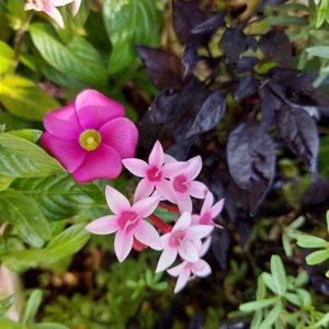 ペンタスの隙間から覗かせ咲いたオキザリスと観賞用とうがらしの 3ショット💞