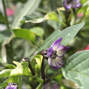 観賞用トウガラシ♪ パープルフラッシュ♪ 零れ種からゆっくり生長して プランターの隅っこで ちっちゃなお花が咲き始めました✨✨✨💜🥰💕🎶 昨年お迎えした時は シックな濃い紫の葉っぱとお花、光沢の有る実で 全体的に深い紫色の印象でしたが 今年種から育った方は 全体的に緑で 昨年の雰囲気とは違っています🤭💜💚💕🎶 これから変化していくのでしょうか🤔 蕾も沢山つき始めてどんな実になるのか 生長が楽しみです💜💕🎶🥰 🏷金曜日の蕾たち 🏷ちっちゃいものクラブ に参加させてください🎶