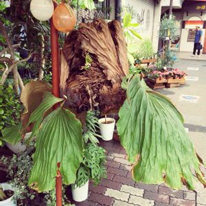 珍しい植物に出会いました。 プラティセリウムエレファントティスというコウモリランの一種。 垂れ下がってる緑の葉が持ち上がって枯れてくるのだそうです。