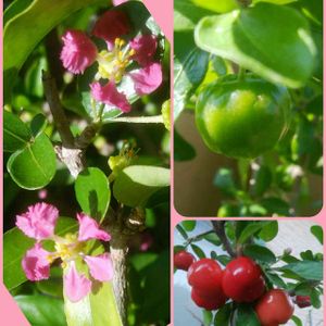 「アセロラ」 今年二度目のお花が咲き青い実がつきました。 一度目は室内にある時で花は沢山咲きましたが実がつかず! (右下は昨年の完熟の実)