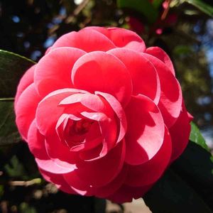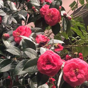 千重の山茶花 品種が分かりません。 今一番庭の中で華やかに咲き誇っています💕 追記 花友さんの協力で 乙女椿に似ているので 紅乙女山茶花ではないかと 見当を付けました。 再追記紅乙女椿