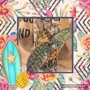 少し薄暗くてすみません… カトレア モスコンベ バリエガータ と申します〜 今はお花は咲いてないですけど、きっとそのうち、ピンクと赤紫のお花を咲かせます🌸🌸🌸🌸🌸 斑入りの葉っぱのキレイなところもイイですよ〜✨✨✨ 新芽も出て来てるので、もうすぐコルクに引っ越しま〜す🍀