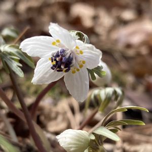セツブンソウ ここは日本有数のセツブンソウ自生地。セツブンソウ園です。 やはり今日は地元でも雪❄️です。 もっと数増えた頃行きたかったけど、早めに行って良かったと思いました💕 ①可愛いバックシャンのセツブンソウ✨✨ ②③遠景ですが、小さなセツブンソウが沢山咲いてる様子がわかるでしょうか? ④太陽の方向いて健気に咲いています。 ⑤この子は白い萼片の数が多い八重咲きですね〜 青軸のセツブンソウを繁々と探していたら、若い女性の方が、八重咲きですよ!と教えてくださいました🤗 セツブンソウの白い部分は萼片で、本来の花弁は黄色い蜜腺に変化しています。萼片は何枚あるのかなぁ〜 通常は5枚で、4枚から10枚まで変異することがあるそうです。 あ!自分でも6枚の萼片の子を見つけましたよ🤗 今回は青軸の子はまだ開花してなかったようですが、鉢植えに植えられた青軸のセツブンソウを別投稿で後ほど投稿したいとおもいます。 📷 2025/3/1/ 小鹿野節分草園