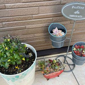 玄関の花たち 鳥に花を摘まれてしまいました💦 近くにはズタズタにされた無惨な花びらや花が丸ごと落ちていました😭 多肉ちゃんもひとつだけ摘まれてポイっとされていました😭😭 ビオラも多肉ちゃんと同じ軒下にとりあえず避難です😰 鳥さん、見る分にはかわいいんだけどなぁ☺️♡