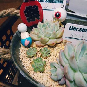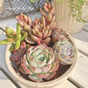 優しい色合いにまとまってお気に入りの寄せ植え。 ちょっと危なそうな子もいるのですが、基本的にはまだ無事です😅 アンポラちゃんがずいぶん開きましたが、これはこれでかわいい(*´∀`) ペチャッと潰れた成長点がまるでエレガンス系みたいだけど、エレガンス入ってるのかな?✨ 韓国苗なので謎ですσ( ̄∇ ̄;) やっぱり夏場はリメ缶よりリメ鉢の方が多肉ちゃんたち元気なのかも😊 危なそうな子(バニラシフォン)も頑張って🙏