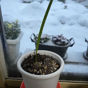 食べたタネからデーツ、一歳3ヶ月くらい(そう思うと可愛さ倍増❤️❣️) あの、暑い夏を難なく乗り越えて 元気です。葉っぱも増えました。 冬はストーブのある部屋に引っ越しです。