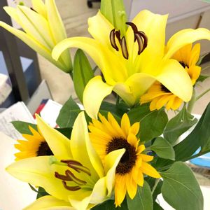 🍒Y銀行カウンター今週のおもてなし💐 ユリの花とヒマワリ🌻✨ 初夏のイメージでしょうか( *´艸`)
