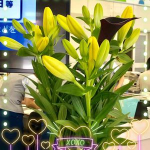 🍒Y銀行窓口カウンターのおもてなし💐 ツボミだったユリが咲いてます💛 白かと思ったら、優しい黄色でした🤗
