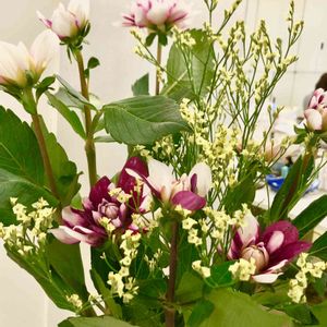 🍒Y銀行の今週のおもてなし花💐 トルコキキョウだよね(・・?) 不安だったのでググったら、これもトルコキキョウだった♪( ´θ`) 別名がユートマス、リシアンサスですって✋ リンドウ科ユーストマ属だそうです❣️