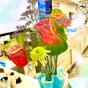 🍒Y銀行窓口の今週のおもてなし花💐 色で、カンガルーポーかと思った😅 ヤシの葉っぱは先週から持ち越し? 賑やかでイイ感じ👍
