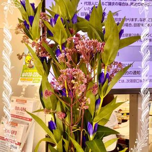 🍒Y銀行窓口の今週のおもてなし花💐 リンドウ出ちゃった😳 ピンクのツボミはナニ(・・)?? 葉っぱ全部処理されてるし(´°ᗜ°)ハハッ..