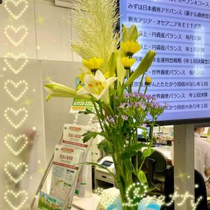🍒Y銀行窓口の今週のおもてなし花💐 剣山使って活けてある(ᵒ̤̑ ₀̑ ᵒ̤̑)wow!*✰ お花の担当さん変わった⁉️
