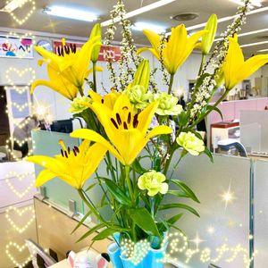 🍒Y銀行窓口の今週のおもてなし花💐 黄色いスカシユリ💛 枝はなんだろσ( ̄^ ̄)? 見た事あるヤツだけど(;-ω-)ウーン (・⊿・)ワカラン