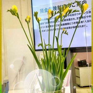 🍒Y銀行窓口の今週のおもてなし花💐 フリージア💛月曜日に🤳撮るとチョットさみしい•́ω•̀)?