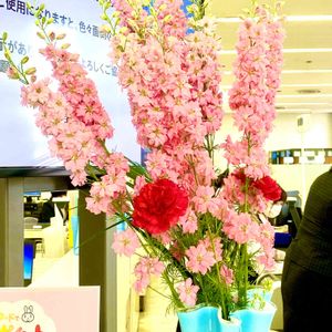 🍒Y銀行窓口のおもてなし花💐 ビンクのデルフィニウムに真っ赤な🌹……じゃなくカーネーション😆 キレイキレイ👏🏻