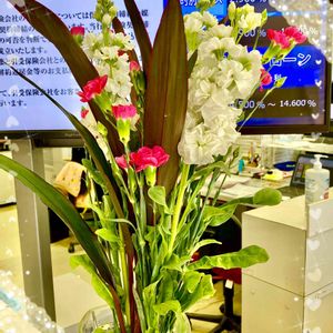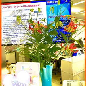 🍒Y銀行窓口の今週のおもてなし花💐 赤いグロリオサと白いカスミソウ🤗 火の玉飛んでるみたい🤣