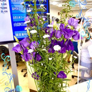 🍒Y銀行窓口の今週のおもてなし花💐 クジャクアスター?と。。。実はパッと見た時 フウリンソウだと思った(´°ᗜ°)ハハッ.. トルコキキョウでした🌀