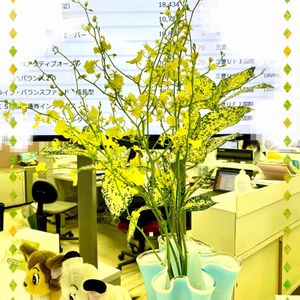 🍒Y銀行窓口の今週のおもてなし花💐 オンシジュームとゴットセフィアナ🌿 斑入りアオキじゃないよネ┃ω・๑)ジィー🔎✨