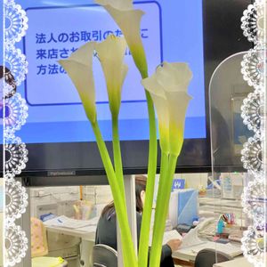 🍒Y銀行窓口の今週のおもてなし花💐 スッキリと美しい姿の白いカラー✨ 背筋が伸びます∠( ˙-˙ )/