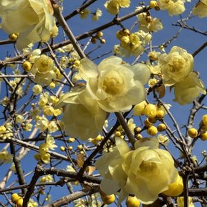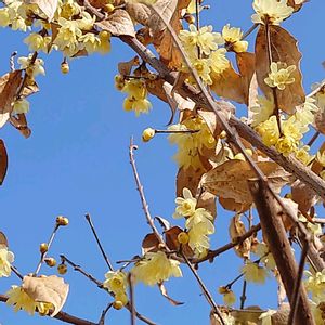 ロウバイ クッキリと青空に咲いて来た〜葉っぱもまだ付いてる