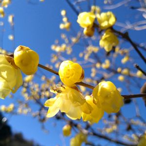 ロウバイ(蝋梅) [今日のお花] 今日午前中ふなばしアンデルセン公園に行ってきました。 ロウバイが満開です。 いい香りがあたりに漂ってカメラマンが吸い寄せられてきます。 透き通った花びらが快晴の空に鮮やかです。 花びら全体が黄色いソシンロウバイです。