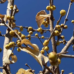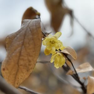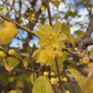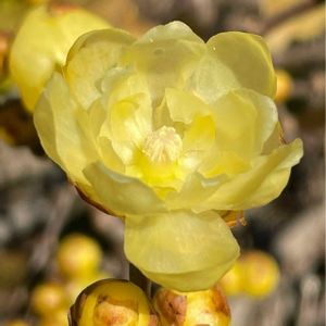 ソシンロウバイ(素心蝋梅) ロウバイ科 同属 中国中部を原産とするロウバイの一品種 別名 カラウメ、シロバナロウバイ 原種のロウバイは花の中心部が暗紫色で周りが黄色であるが、ソシンロウバイは中心部を含めて花全体が黄色である ソシンは素心あるいは素芯で、園芸の世界では花弁が中心部まで同じ色である事を表す 花期 11〜2月、花の大きさ約3cm 花弁は半透明で、青空の下蝋細工のように艶がある様に見えます 花柄は無く枝から直接花が咲きます 香りは水仙の様な香りでそれよりもっと強い香りで、とても上品な香りです 去年実った果実の殻が付いています(果期は6〜8月)