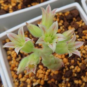 ロスラリアのクリサンタエルブルースの花が咲いた。エケベリアで見る花とは少し趣が異なる。 この手の多肉は花の後枯れることが多いので,これ以外の10個以上あった株を全部カットして他の鉢に植え替えたけど,必要なかったかも。