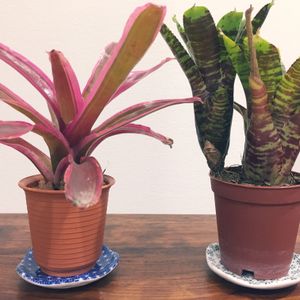 左: Neoregelia 'Fireball' 右: Neoregelia ‘Alley Cat’ ブロメリアとビカクシダの師匠のお使い(刺客w)として先日のBBでステッカーをゲットしたら、こんなに立派な苗を、それも2つも頂きました!貧乏顔の勝利なのか!?師匠!ありがとうございます😊大切に育てさせて頂きます!