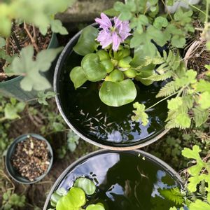 夏はあまり咲かなかったのに今頃またホテイソウが咲いています。 半日陰でパンダメダカたちは無事、夏越し出来ました〜(昨年は茹で上がって可哀想なことしました😢)