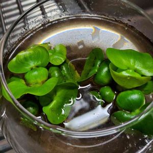 今朝の散歩道で とあるお宅の玄関前にご自由にどうぞ、とホテイソウの子株が置いてあったので1つもらって帰りました。 とりあえずガラスの水鉢に浮かべてみました😃 早起きは三文の得という言葉を思い出しました🎵
