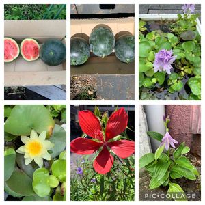 初めての小玉スイカ 1週間前に1個収穫 まだ白かったけど食べれました。昨日2個 今朝3個収穫。 種から育てたのは、まだかな?