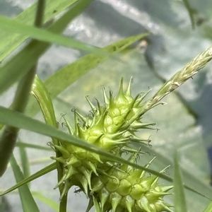 タカネマスクサ おや?これはなんだろう? カヤツリグサの同定が出来るようになったら、お散歩はもっと楽しいだろうなぁ…と思いながら、小さな滝のそばでしみじみと眺める チームうずくまり🏷️ 卵形の小穂が3個やや間隔を空けてついていて、上より下の間隔は広い… とても長い葉状の苞… タカネとあるが、平地に生えているマスクサの仲間だと当たりを付ける😃 合ってますかね? 小穂のほとんどは雌花部でチョロチョロと出ているのは2本ずつ出ている雌しべの柱頭、基部からわずかに長い糸のようなものを出している部分が雄花部のようだ👀(2、3枚目) どの株をみても先端だけは細長い小穂がついていて、これは他のスゲにもあるように形を変えた雄性穂だろう🟢(4枚目) 緑に眼を休めるビューティフルサンデー🏷️ どなたさまもご安全に✨