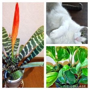 今日も1日頑張りました🙆 にゃんこも暑さでご覧のとおりです🤭 右下の植物がわからないのですが、どなたか教えてください🥺 ペペロミアとは違う?